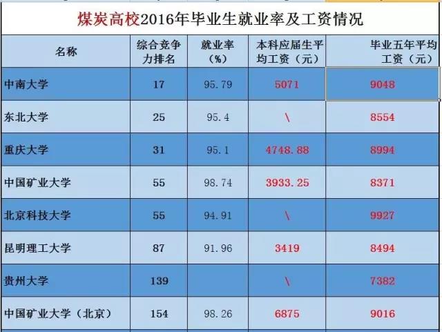 煤炭行业,顾名思义,是以开采煤炭资源为主的一个产业。它是国家能源的主要来源之一,也是国家经济的重要支柱之一。近些年来去产能的要求日益紧迫,很多煤炭企业生存困难,但这并不代表着煤炭行业从业人员工资就比别人低,毕竟煤炭是“国家经济的重要支柱”嘛。下面我们看看煤炭类高校2016年毕业生的情况。