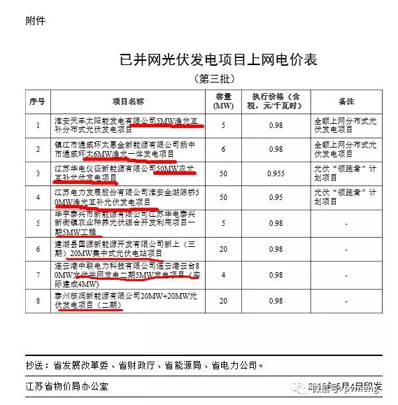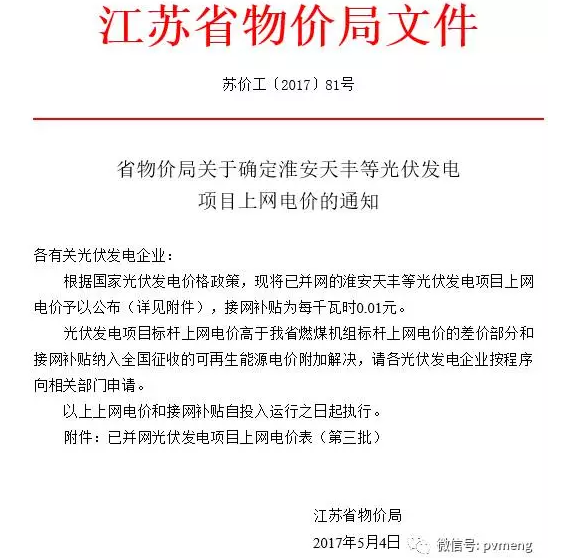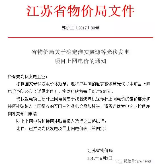 首先,我们看下2016年江苏省物价局出具的最后一个光伏发电项目电价批复文件: