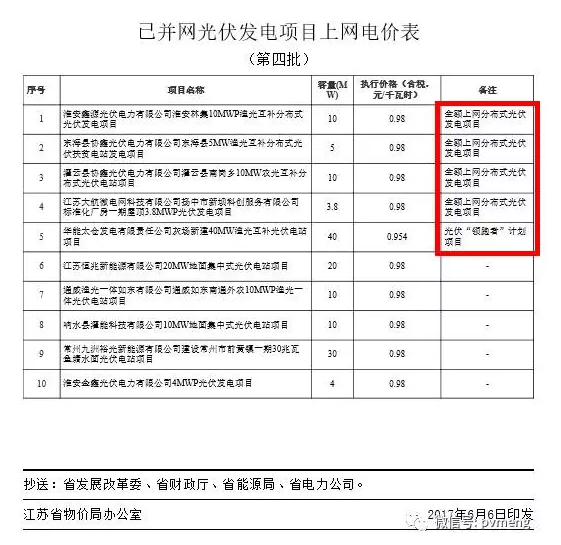大家仔细看一下标注的位置,不难发现:江苏省物价局从2016年最后一批光伏发电项目电价批复开始,基本没有再批复屋顶分布式光伏的项目,都是地面分布式、扶贫分布式、领跑者项目。