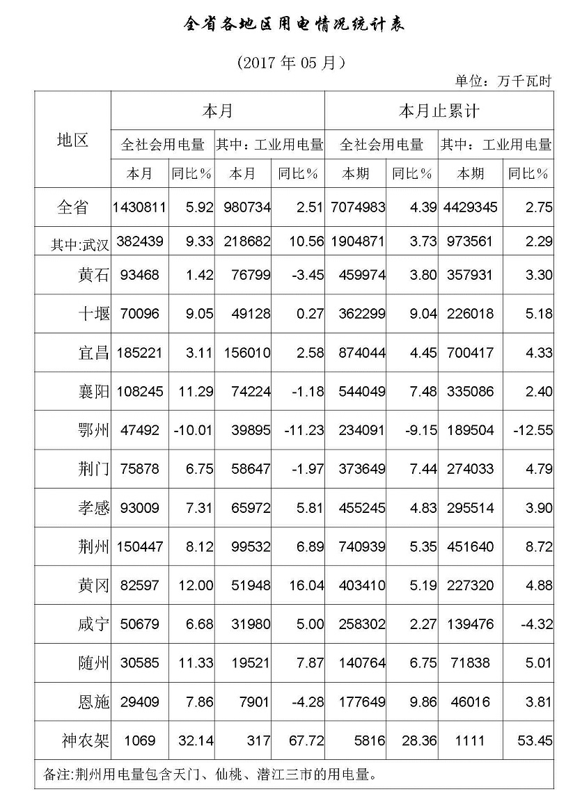 (五)全省各地用电普遍增长,仅鄂州1地因钢铁行业去产能用电下降。5月份全省14个用电统计地区中,武汉、襄阳等13地全社会用电不同程度增长,其中襄阳、黄冈、随州3地全社会用电增幅在两位数以上,仅鄂州1地全社会用电下降。省会城市武汉当月全社会用电38.24亿千瓦时,增长9.33%,其中工业用电21.87亿千瓦时,增长10.56%,增幅均远超全省平均水平,领头羊地位巩固。鄂州市强力淘汰钢铁行业落后产能,由此该地当月全社会和工业用电出现较大降幅。