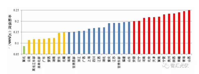 1)全国光伏项目的补贴强度0.3253~0.5295元/kWh之间;