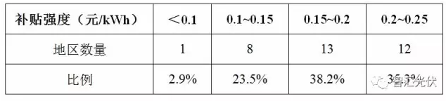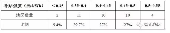 可见,83.8%的地区,光伏电站的补贴强度集中在0.35~0.5元/kWh之间。
