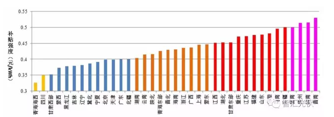 根据国家把光伏电站划分为三类资源区,由于部分省份的不同市分属于在2个资源区,因此,全国所有省份的风电项目,共有37个补贴强度,如下图所示。