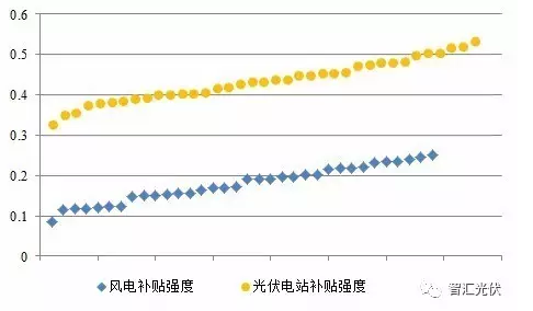 通过上述分析,风电、光伏项目的补贴强度分布对比如下图所示。