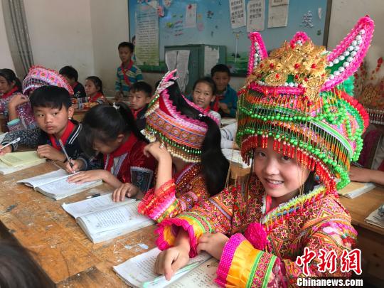 新街村完全小学九成以上的学生为少数民族人口,图为该校学生着民族服饰在课堂中。 钟建珊 摄