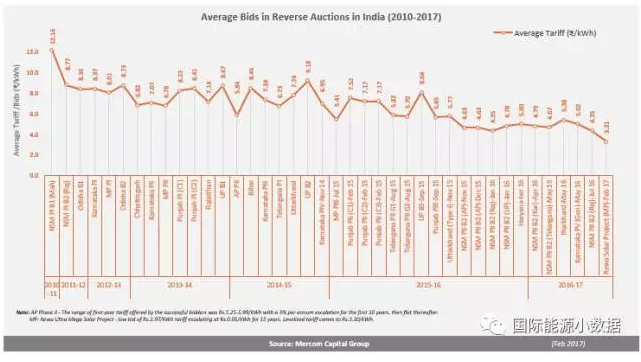 根据Mercom整理的数据,2010年到2017年印度光伏项目竞标报价下跌了73%。2010年10月份150兆瓦项目竞标报价为12.16卢比(17美分)/千瓦时,到2016年1月已经跌至4.35卢比(7美分)/千瓦时,而2017年最近一次竞标的报价已经低至2.44卢比(4美分)/千瓦时。