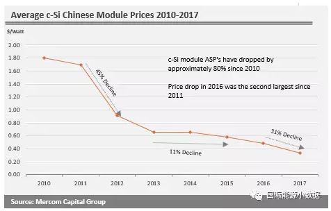 印度光伏报价节节走低与中国制造的光伏电池、组件价格下降密切相关。2010年到2017年,中国生产的晶硅光伏组件下降了80%。2016年下降了31%,是近年来下降幅度最大的一年。