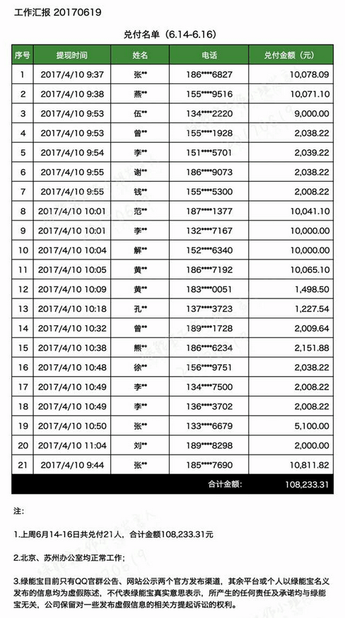 6月20日,有投资者在网贷之家发帖称,“绿能宝重启兑付,目前只兑付小额”,并曝光了6月14日至16日的兑付名单,此次一共兑付了10万8千多元。