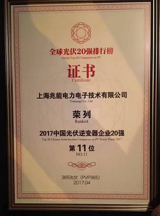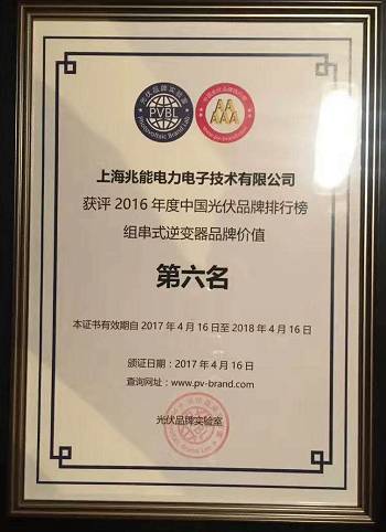 上海兆能以实力说话,在两场评选中分别荣获2016年度中国光伏品牌排行榜“组串式逆变器品牌价值第六名”和“2017中国光伏逆变器企业20强第11名”。