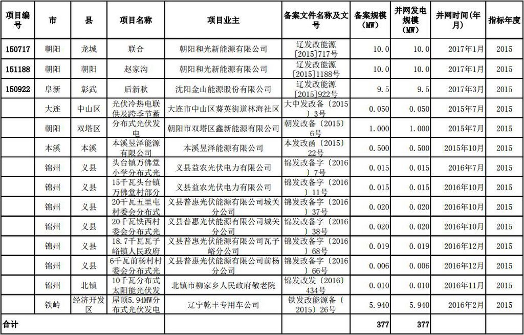 辽宁发改委公示377MW普通光伏电站纳入年度规模指标项目