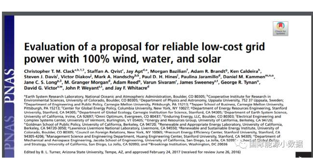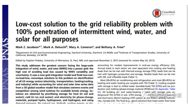 2015年11月美国斯坦福大学Mark Z Jacobson教授等4位学者在《美国国家科学院院刊》(英语:Proceedings of the National Academy of Sciences of the United States of America,通常简称为PNAS)发表题为Low-cost solution to the grid reliability problem with 100% penetration