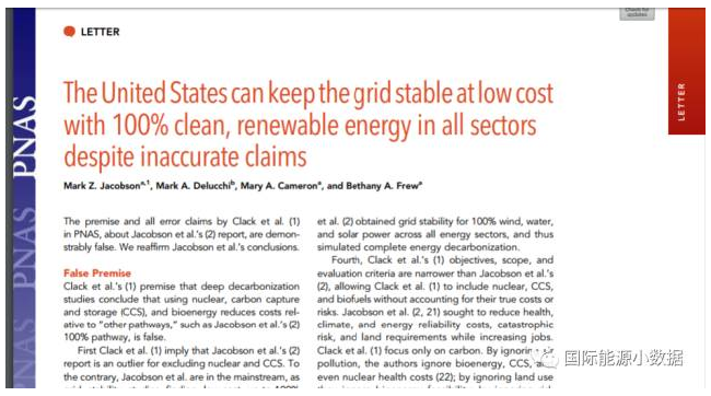 针对Mark Z Jacobson教授等学者的观点,在最近一期的PNAS杂志上发表了美国国家海洋和大气管理局地球系统研究实验室的学者Christopher T. M. Clack等21位美国研究人员(包括物理学家、工程师、气候专家)的文章,题目是evaluation of a proposal for reliable low-cost grid power with 100% wind, water, and solar,认为Mark Z Jacobson教授的研究使用了无效的模型工具和错误模型,包括不可能和不适当的数据和假设(比如大大高估了水电和氢能的潜力)。因此,Mark Z Jacobson教授关于2050-2055年实现100%可再生能源的结论不能成立,文章提醒政策制定者对待能源低碳转型不能急于求成。