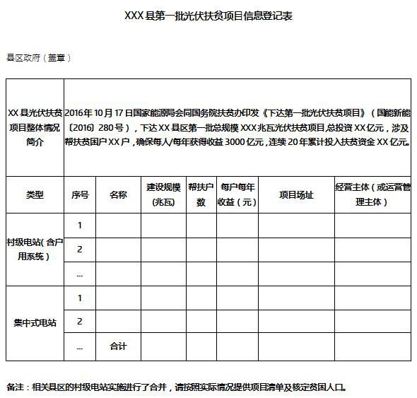 2016年10月17日,国家能源局与国务院扶贫办联合印发《下达第一批光伏扶贫项目》(国能新能〔2016〕280号),其中下达我市光伏扶贫项目建设指标266.291兆瓦,可帮扶贫困户16362户。目前项目正在建设中,计划2017年10月底前全部实施完成。为深入推进我市脱贫攻坚工作,提高扶贫精准度,确保后续光伏扶贫收益分配扎实有效开展,如期实现贫困户每年每户不低于3000元的扶贫收益目标。要求各县区政府按照贫困人口建档立卡有关规定,对2016年国家能源局下达我市的第一批光伏扶贫项目对应帮扶的16362户建档立卡贫困户再认定、再精确,开展进一步审核确认工作,现通知如下:
