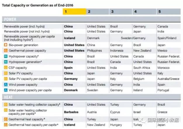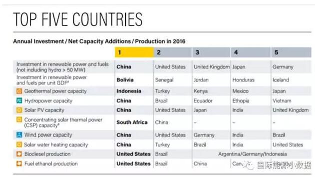 此外,玻利维亚获得2016年单位GDP投资可再生能源比例冠军,冰岛获得人均可再生能源装机冠军,德国获得人均光伏装机第一,西班牙获得太阳能光热发电累计装机容量冠军。