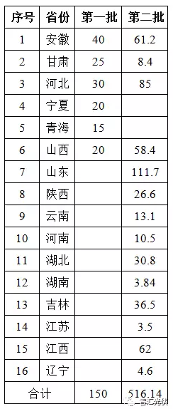 至今为止,国家已经下发了两批光伏扶贫指标,共涉及16个省,累计规模666.14万kW,具体如下表。