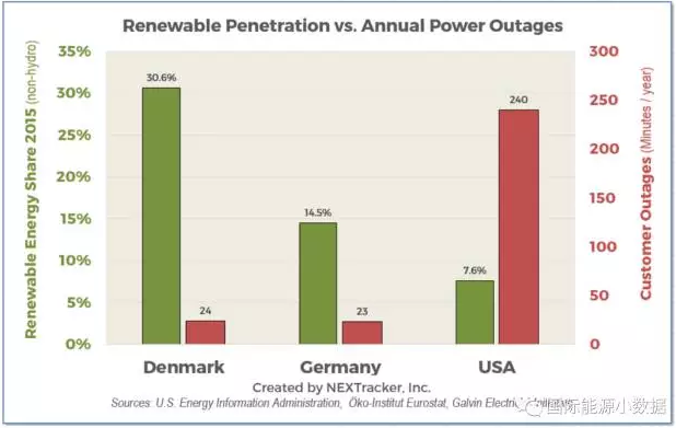 如图示,德国风电、光伏发电比例达14.5%,但是用户年平均断电仅23分钟;而美国的风电、光伏比例仅为7.6%,但是用户年平均断电达240分钟。在丹麦,间歇性可再生能源比例高达30.6%,用户年平均断电仅为24分钟。