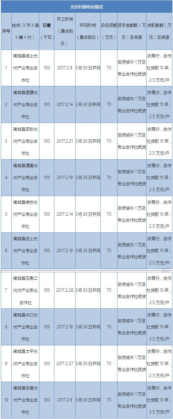 南城县委、县政府十分重视光伏产业扶贫工作,成立了南城县光伏产业扶贫工作领导小组,由分管农业的副县长卢碧兰同志任组长、县发改委、县扶贫和移民局等相关单位的负责人为成员。县委办、政府办专门印发了《南城县光伏产业扶贫行动实施办法》。同时,投资700万元,在全县十个贫困村成立光伏产业专业合作社,新建十个村级光伏电站,建设规模共计1000KWP。(见附表)