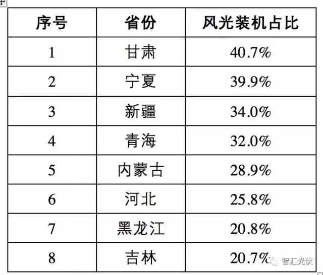 截至2016年底,全国各省风电、光伏累计装机占比达到20%以上的省份如下表。