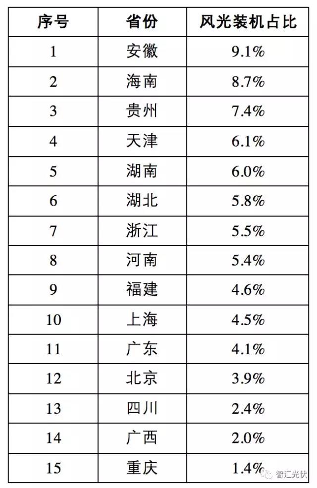 截至2016年底,全国各省风电、光伏累计装机占比不足10%以上的省份如下表。
