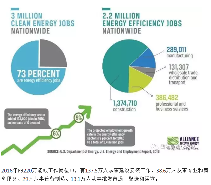根据美国能源部《2016年能源与就业报告》,2016年美国清洁能源(包括能效、可再生能源)从业人数达到300万人,其中220万从事能效工作,比2016年增加13.3万人(+6%),预计2017年能效部门就业人数将再增加9%,达到240万人。