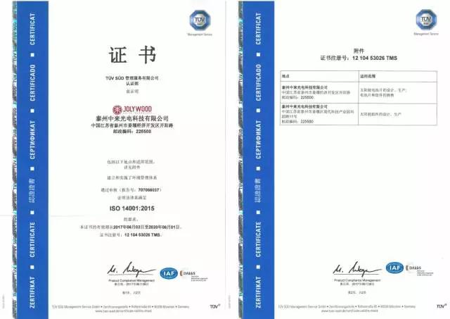 中来光电自建厂以来,为了进一步规范制造管理,提升产品质量及生产效率,积极推动三标一体管理体系,公司内部各部门组织学习体系标准,并展开体系建设工作,通过公司内部良好的管理,并不断强化品质管理,从而使中来光电在较短的时间内顺利通过三标一体认证,这为公司今后向产业提供优质的产品和服务提供了更强有力的保障。