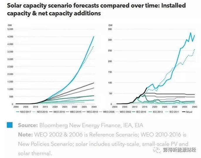 2017年彭博新能源财经新能源市场长期展望预测,光伏和光热的总装机将达4,506GW,而IEA报告则仅在“新政策情景”下,给出了1481GW的预测值。