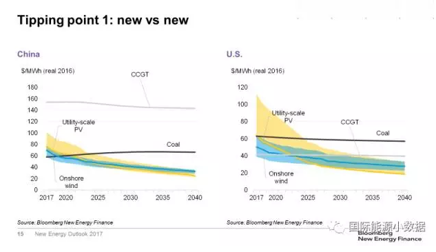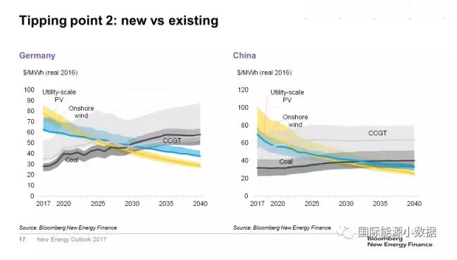 第一个临界点是:在没有补贴的情况下,新建风电、光伏电站发电成本可与新建煤电、天然气电站竞争。在目前的市场条件下,在很多国家已经接近这一临界点。在德国,新建陆上风电的发电成本已经低于煤电、天然气发电;在中国,目前煤电成本在各类电源中依然是最低的,但是预期2019年陆上风电成本将低于煤电、2021年光伏成本也将低于煤电;在美国,天然气发电是各类电源中成本最低的,但预计2022-2023年风电、光伏成本均将低于天然气发电;在印度,预计2020年起新建光伏将在全国范围内低于煤电。