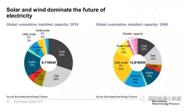 根据BNEF的预测,2040年太阳能光伏将成为主导能源之一,占全球发电总装机的32%;风电14%、水电12%、煤电14%、天然气13%、核电3%。