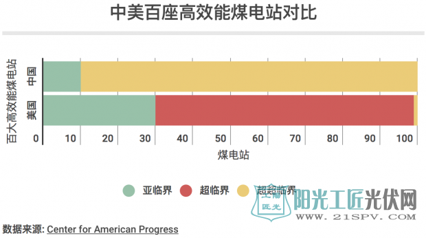 超超临界燃煤发电技术也有望帮助相关电厂达到这个相对严格的环保要求。相比于亚临界燃煤机组,超超临界火力发电机组的燃煤温度更高(约760摄氏度),内部压力也更大(超过3万多千帕),因此发电效率也更高。美国进步中心(Center for American Progress,后文简称CAP)最新发布的一份报告显示,中国能效最高的100家燃煤电厂中超过90%配备了超超临界技术设备,而美国的这一数字仅为0.76%。显然,中国在这一方面步子迈得比美国更大。
