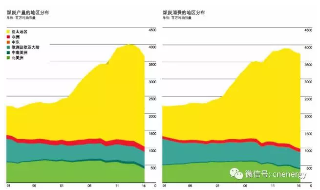 2016年,世界煤炭产量下降了6.2%,2.31亿吨油当量,是有史以来最大的降幅。中国的产量下降了7.9%,1.4吨油当量,也是有史以来最大的降幅。美国的产量下降了19%,8500万吨油当量。全球煤炭消费下降了1.7%,连续第二年下降。最大的跌幅在美国(3300万吨油当量),中国(2600万吨油当量,下降1.6%)和英国(1200万吨油当量,下降52.5%)。