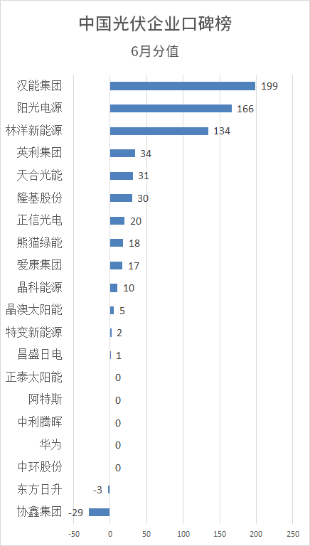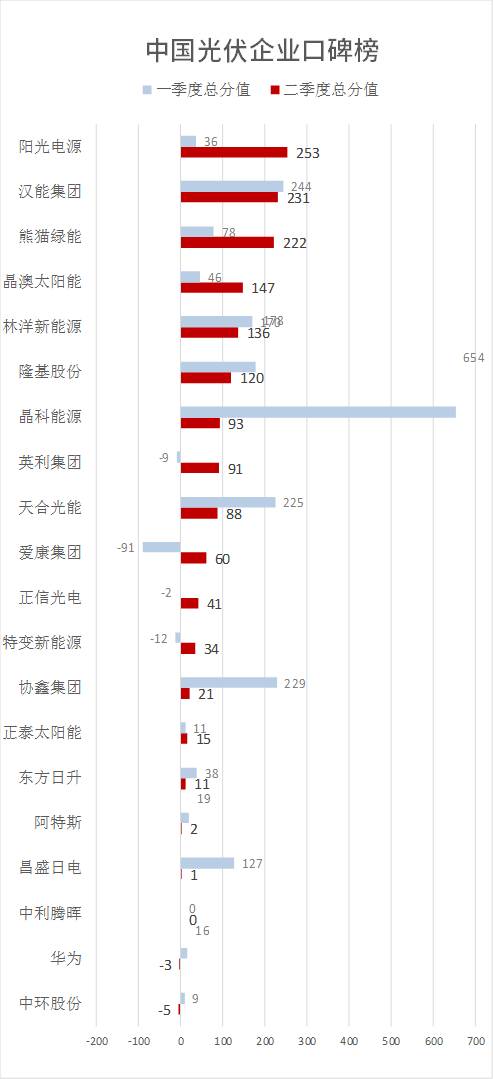 二季度,以20家样本企业为代表的光伏企业收获的正向分值1566,负向分值仅为-8;而一季度,正向分值达2080,但负向分值则高达-114。一季度,口碑分值为负的企业,总数为4家,到二季度,则减少到2家。