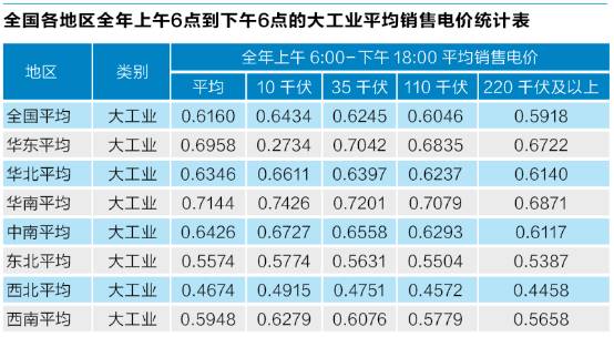 上表是全国各地区全年上午6点到下午6点的大工业平均销售电价统计表。