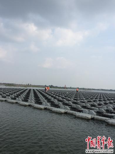 刘龙村边上的泥河早前只是一条大沟,连着淮河,后来“越陷越深,塌成这么大”。马赵匡身后的水面有4000亩,波光闪闪,他在岸上搬运组件、拼接,然后拖入深达7米的水中央。
