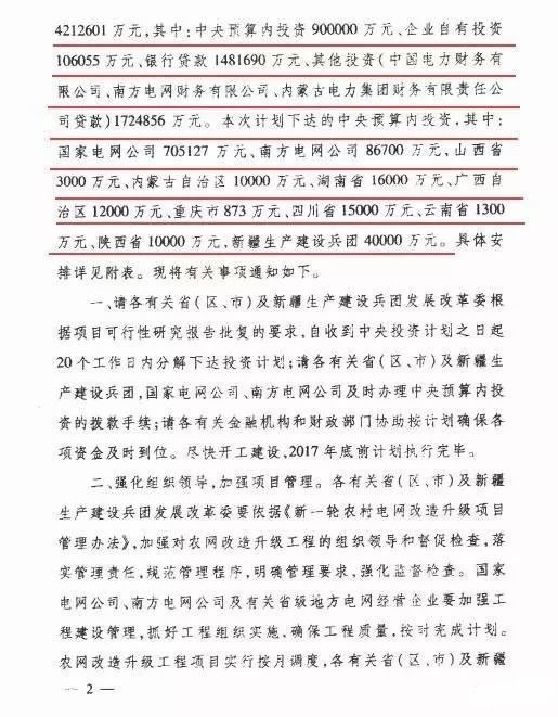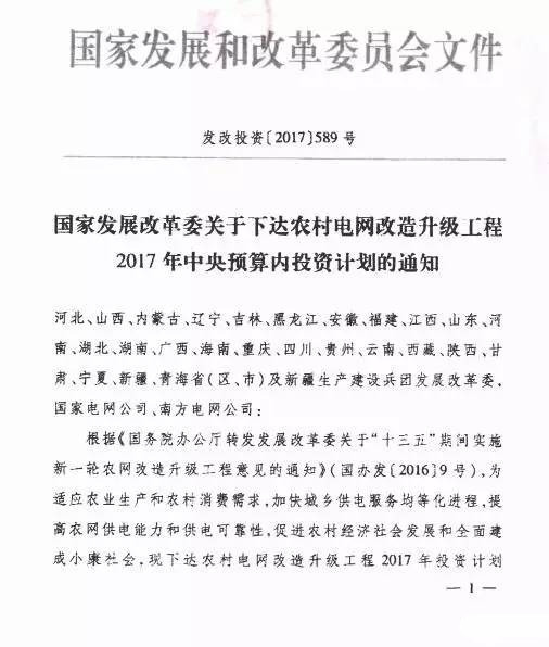 近日,国家发改委下达农村电网改造升级工程2017年投资计划4212601万元,其中:中央预算内投资900000万元,企业自有投资106055万元,银行贷款1481690万元、其他投资(中国电力财务有限公司、南方电网财务有限公司、内蒙古电力集团财务有限公司贷款)1724856万元。本次计划下达的中央预算内投资,其中:国家电网公司705127万元、南方电网公司86700万元,山西省3000万元、内蒙古自治区10000万元、湖南省16000万元、广西自治区12000万元、重庆873万元、四川省15000万元、云南省1300万元、陕西省10000万元、新疆生产建设兵团40000万元。