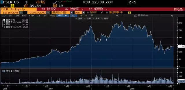 自光伏企业在美国上市,美股投资者就'疯狂'追逐着:以FSLR为例,自其2006年11月上市,在短短1年半的时间,股价就涨了10倍,市值最高超过200亿美金(折合1400亿人民币),而当时FSLR的收入仅为5.04亿美金,净利润为1.58亿美金。