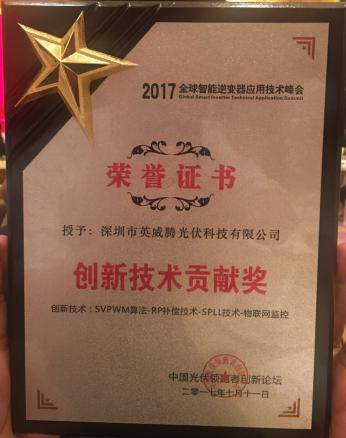 英威腾光伏多环控制算法技术、物联网监控荣获——创新技术贡献奖