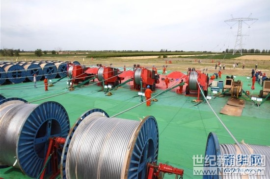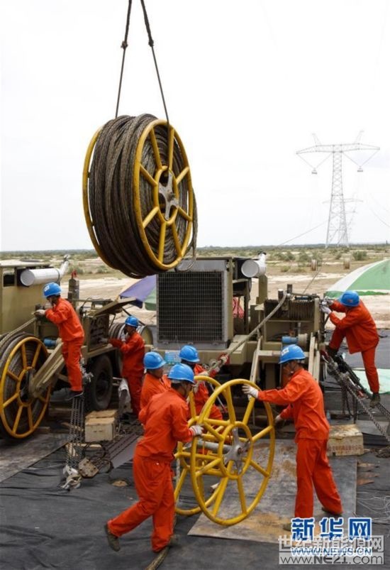 这是在位于新疆奇台县境内的昌吉-古泉±1100千伏特高压输电工程新疆段施工工地液压张力放线现场(7月12日摄)。从7月12日起,昌吉-古泉±1100千伏特高压直流输电工程新疆段进入放线阶段。该工程全长3300多公里,途经新疆、甘肃、宁夏、陕西、河南、安徽六省区,其中新疆段长约600公里。新华社发(王磊 摄)