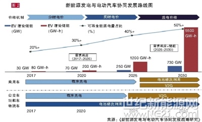 值得注意的是,《报告》发布了新能源发电与电动汽车协同发展路线图(如图2)。“如图所示,可再生能源发电量占比将从目前25%提升至50%以上,电动汽车储能理论潜力也将从目前的30GW-100GWh提升至700GW-3800GWh。”刘坚强调,在不同时段引入合理的价格机制和并网模式是发掘电动汽车储能潜力的关键。