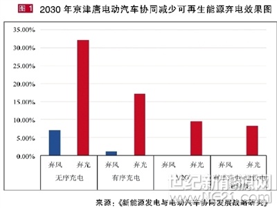 《报告》特别对2030年京津唐地区电动汽车协同减少可再生能源弃电效果进行了场景分析(如图1)。“不难看出,在无序充电情况下,风电、光伏弃电率都非常高。而当引入有序充电及退役电池储能以后,弃风弃光都有明显下降。”《报告》课题组成员、国家可再生能源中心博士刘坚表示。