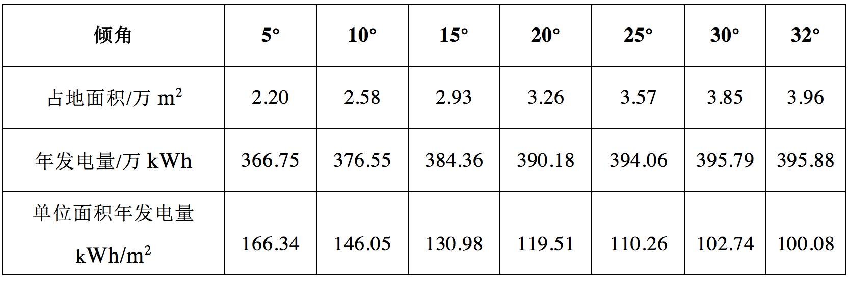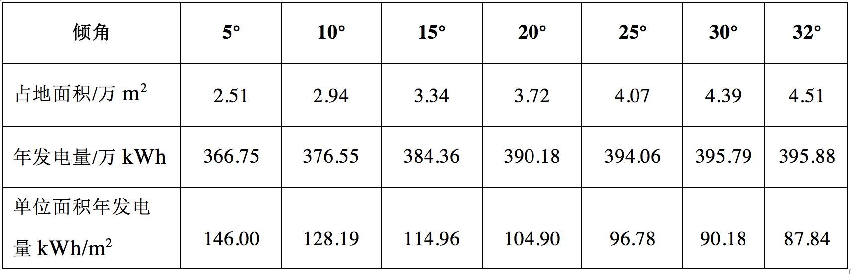 如果倾角降低,将导致发电量降低;然而同时,占地面积将减少。对倾角为5°~32°时,项目单位面积的发电量进行计算,结果如下表。