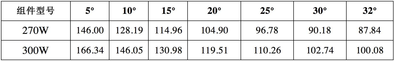 使用高转化效率组件是提升单位面积发电量最有效的方法。表1中数据时采用270Wp组件为基础进行计算,若采用300Wp的高效组件,则5°~32°时单位面积的发电量如表2所示。