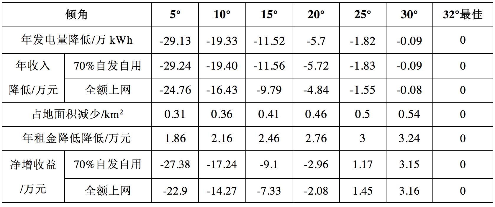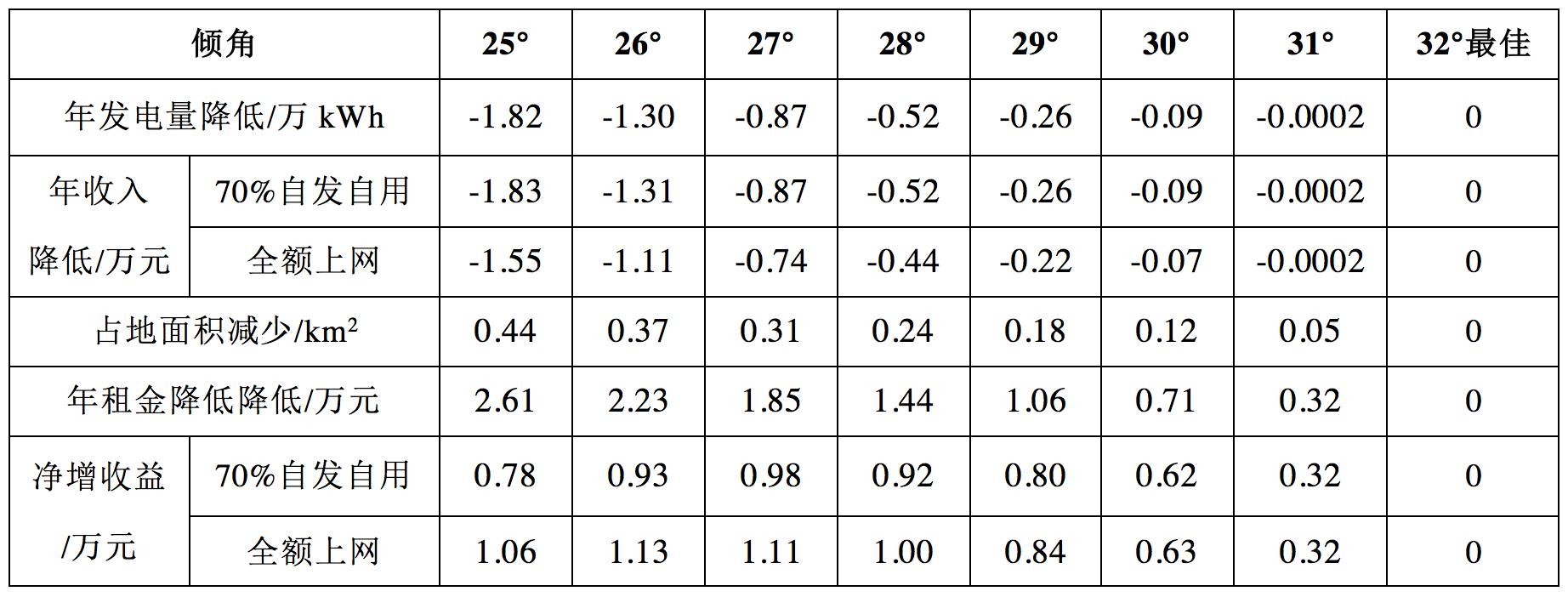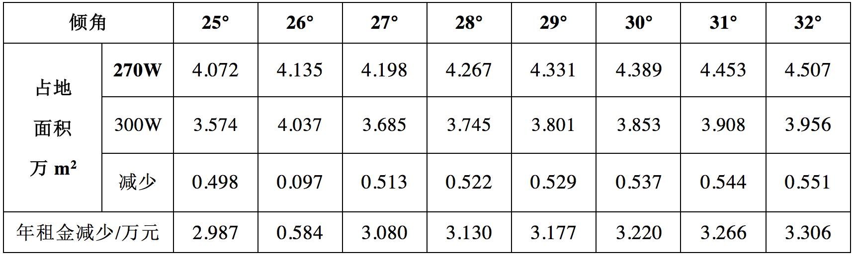 倾角变化的主要影响为非最佳倾角带来发电量降低、减少占到从而节约租金。将两项对比如下表。