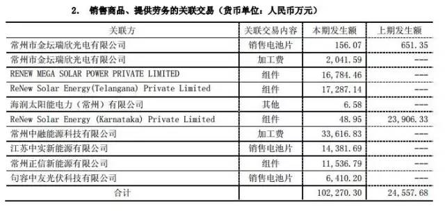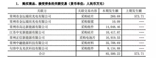 查阅海润光伏2016年财报发现,海润光伏与包括常州市金坛瑞欣光电有限公司、常州市高达新能源有限公司、江苏中实新能源有限公司、常州正信新能源有限公司、常州中融能源科技有限公司、句容中友光伏科技有限公司等九家公司有关联交易。其中购买商品、接受劳务的关联交易金额为8.55亿,而这之前一年仅为573万。销售商品、接受劳务的关联交易金额为10.23亿,较2015年的2.5亿也是大幅增长。