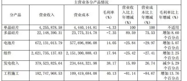 从主营业务各产品情况来看,电池片、组件仍占大头,然而这两块与2015年相比却分别下滑25.84%、25.42%。除此之外,工程施工与2015年相比下滑81.4%。