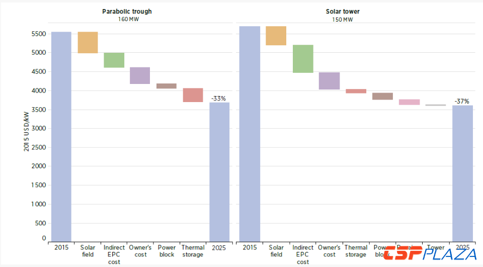 表3:2015-2025年槽式光热电站与塔式光热电站成本下降潜力(来源:IRENA/DLR,2016)