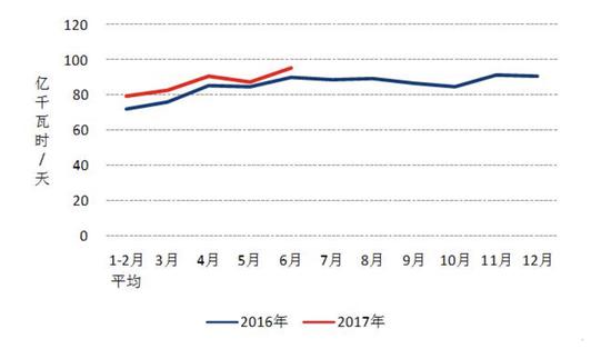 6月份,四大高载能行业用电量合计1586亿千瓦时,同比增长4.3%,增速比上年同期提高6.2个百分点,占全社会用电量的比重为30.2%。其中,化工行业用电量374亿千瓦时,同比增长2.2%,增速比上年同期提高2.0个百分点;建材行业用电量312亿千瓦时,同比增长4.6%,增速比上年同期提高2.6个百分点;黑色金属行业用电量404亿千瓦时,同比下降4.1%,增速比上年同期提高1.1个百分点;有色金属冶炼行业495亿千瓦时,同比增长14.1%,增速比上年同期提高17.0个百分点。