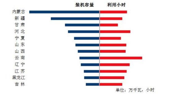 图6 1-6月份风电装机较多省份风电装机容量和设备利用小时