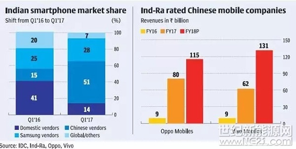 2017年第一季度,中国智能手机占据了印度智能手机市场51%的份额。 互联网数据中心 图