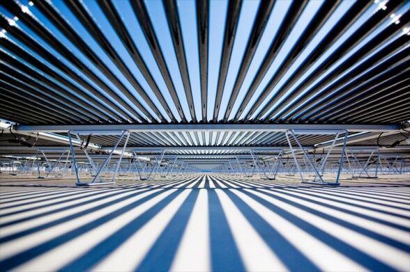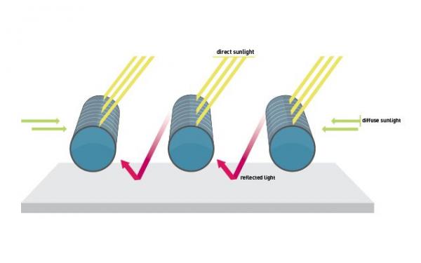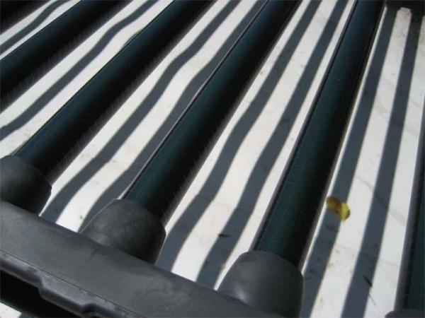 Solyndra的产品概念也是光伏产业中的奇葩。我们所熟知的太阳能电池都是平板结构,北半球的电池板向南倾斜,南半球的电池板向北倾斜,以尽可能多地接收太阳光的辐射。而Solyndra的团队异想天开地宣称,把太阳能电池做成圆柱状,在日升日落的循环中可以接收到更多的太阳能,就是下面这个样子: