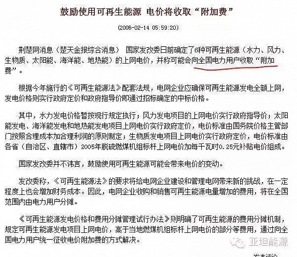 从2006年《可再生能源法》颁布伊始,国家就征收0.002元/千瓦时,用来给新能源进行补贴,然而,这个附加费已经增加到0.019元/千瓦时(2015.12.30日公布),8年增长了7倍。